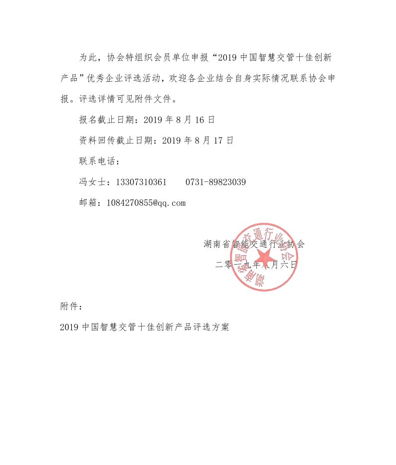 关于组织会员单位申报 2019 中国城市智慧交管论坛 十佳创新评选的通知